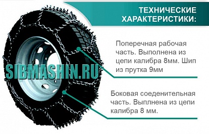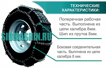 Цепи противоскольжения для грузовых автомобилей на сдвоенные (спаренные) колеса изготавливаются из цепей 6/6 мм, 8/6 мм и 8/8 мм (где первая цифра — калибр поперечной рабочей части цепи, вторая цифра — калибр боковой соединительной части цепи).